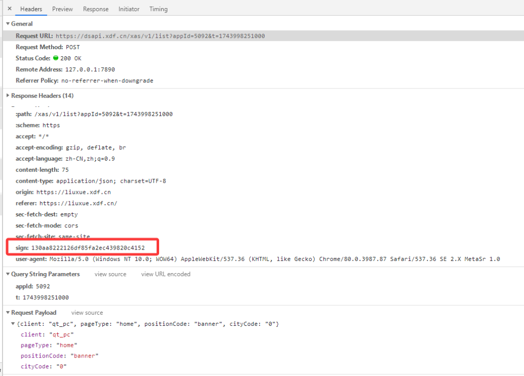 打开网站 https://liuxue.xdf.cn/,在请求面板中找到一个带签名的数据接口 https://dsapi.xdf.cn/xas/v1/list?appId=5092&t=1743995182000