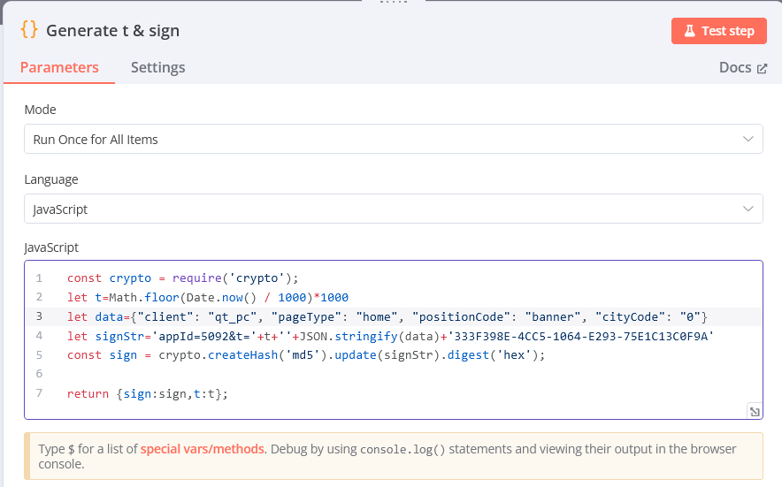 在n8n工作流中新增一个code节点用于生成t和sign。