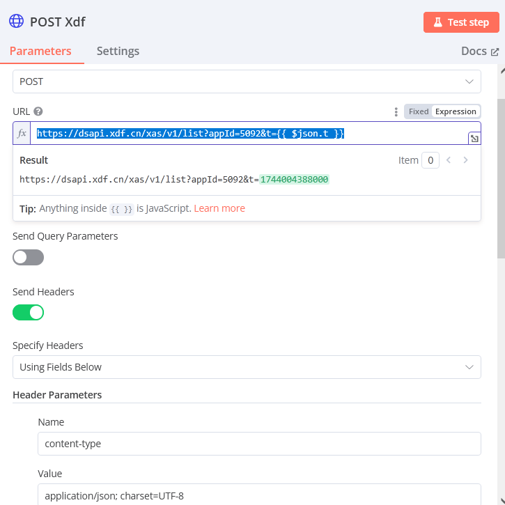 请求url:url是https://dsapi.xdf.cn/xas/v1/list?appId=5092&t={{ $json.t }}